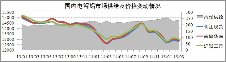 自2014年9月份全国铝价出现高位回落以来,今年前三月份铝价基本在12800元/吨-13100元/吨的区间内波动。市场供给方面,2015年1-2月全国产量分别为262万吨和232万吨,同比增长率约为8%,市场供给并未出现实质性的缩减。目前,全国电解铝市场价格已整体逼近2013年以来的最低水平,预计上半年将进一步跌破至12500元/吨关口,下半年铝价将出现整体回升。