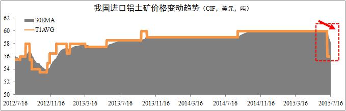 进口矿出现区间跳水现象。市场监控数据显示,自今年7月6日以来,我国进口铝土矿到岸价(CIF)出现异常波动情况,CIF价格出现区间跳水现象。截至7月16日,我国进口铝土矿30天移动平均价格(30EMA)已由60美元下跌至58美元,日均价格(T1AVG)下跌至56美元,区间降幅达7.1%。
