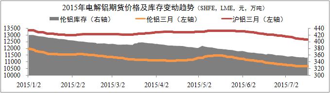 发稿时间:2015-07-18电解铝现货价格继续回落。监控数据显示,7月上旬电解铝现货价格继续保持下滑趋势,且下滑幅度有所扩大。截至7月17日,长江有色现货价格跌至12503元/吨,南储华南跌至12543元/吨,月化日均跌幅分别为0.14%和0.15%,同比分别扩大0.03和0.05个百分点。从数据分布上看,目前现货价格与沪铝三月期货价格之间的差值已收窄至100元左右,预计该趋势将进一步延续。