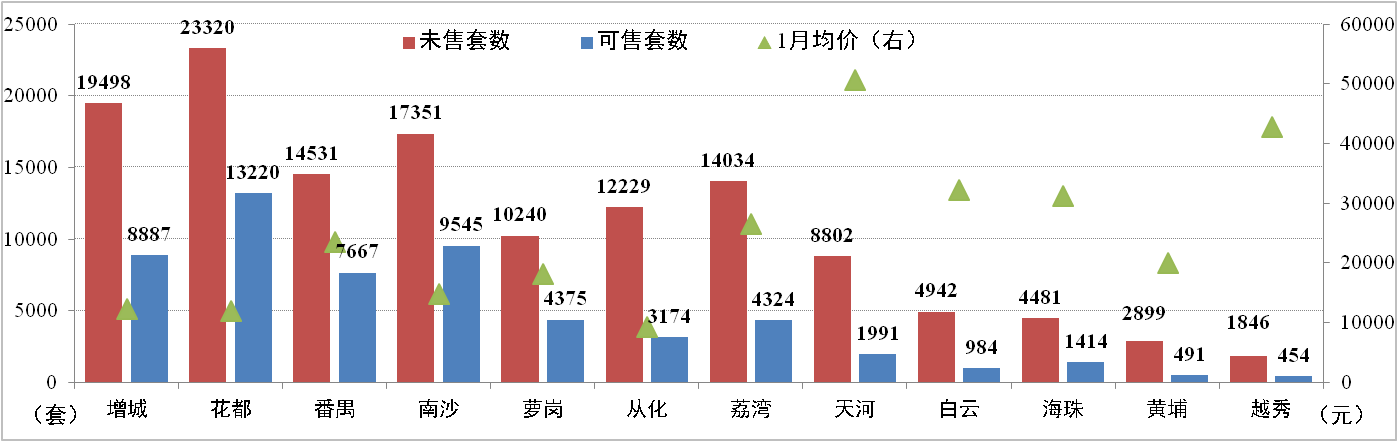 截止2月10日,广州市新建住宅商品房共190,699套,环比减少2.72%。其中可售和未售房源分别为56,526套和134,173套,主要集中在花都、增城、南沙以及番禺四区,合计分别占69.7%和55.7%;增城分别占15.7%和14.5%。