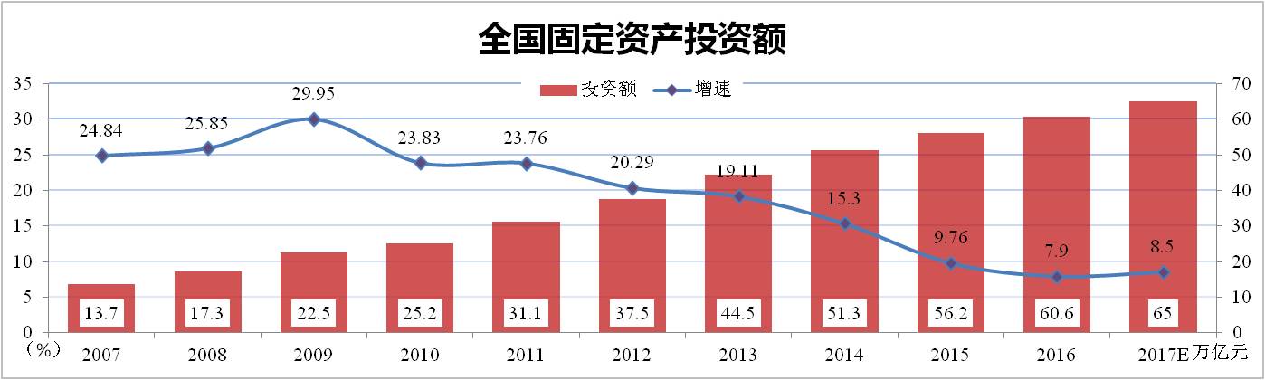 分析认为:2016年以来,中国固定资产投资累计增速的下滑态势得以遏制。预计2017年固定资产投资缓中趋稳、稳中向好的态势会仍然持续,固定资产投资增速呈现小幅波动、稳中有升的可能性较大,全年投资总额将达65万亿元,增速或维持在8.5%左右。