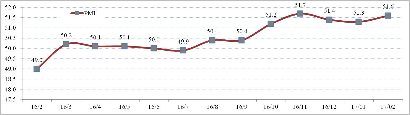 国家统计局数据显示,2017年2月份制造业PMI为51.6%,比上个月上升0.3个百分点。其中,五大分项指数全部上升,生产、新订单、供应商配送时间指数分别为53.7%、 53%、50.5%,分别比上个月上升了0.6、0.2、0.7个百分点。虽然原材料库存和从业人员指数仍然低于荣枯线,分别为48.6%、49.7%,但比上个月上升了0.6个和0.5个百分点。