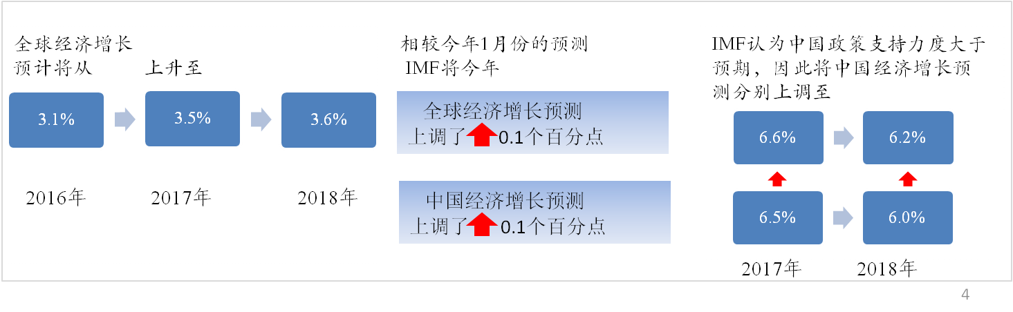根据国际货币基金组织(IMF)《世界经济展望》数据显示,在金融市场以及制造业和贸易周期性复苏支持下,全球经济增长预计将从2016年的3.1%上升至2017年的3.5%和2018年的3.6%。相较1月份IMF将今年全球和中国经济增长预测均上调了0.1个百分点。