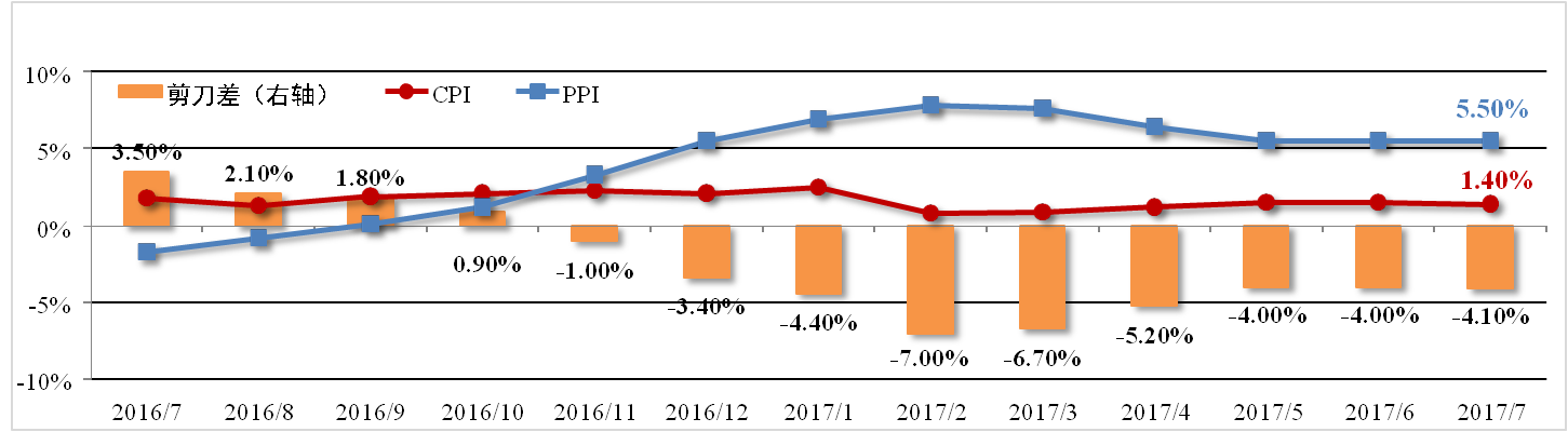 7月份全国居民消费价格指数(CPI)为1.4%,较上月缩小0.1个百分点,主 要原因在于水果大量上市致使鲜果价格下降以及猪肉价格疲软。生产价格指数(PPI)为5.5%,连续三个月持平。剪刀差较上月扩大0.1个百分点至-4.1%。