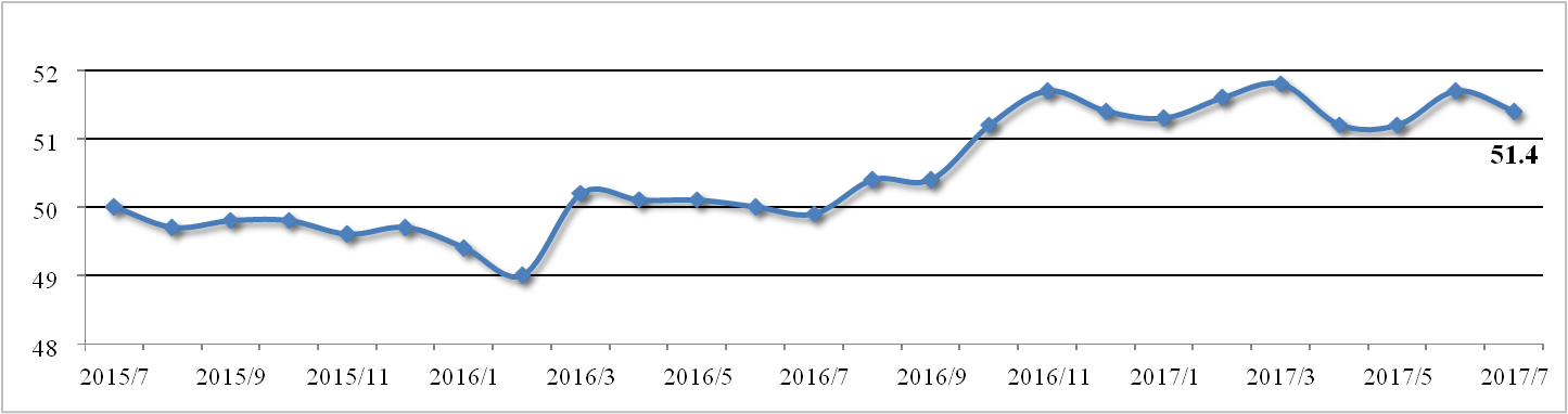 7月官方制造业PMI为51.4%,略低于预期,较上月回落0.3个百分点,依然 位于景气区间。生产指数与新订单指数差值大幅缩小至0.7个百分点,反映制造 业供求关系有所改善,对商品价格形成支撑。