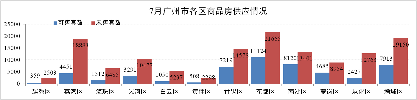 7月31日,广州市新建住宅商品房共189,053套。其中:可售住宅商品房为52,695套,占比27.85%;未售住宅商品房136,394套,占比72.15%。花都、增城、番禺、荔湾库存量较高,可售和未售房源累计占全市比例分别为58.31%和54.46% 。