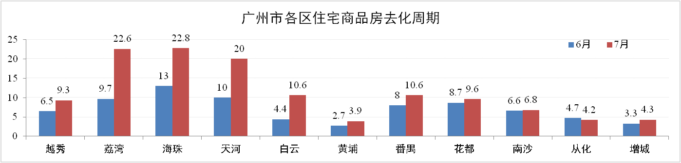 截至7月底,由于近期成交量回落,广州住宅地产去化周期上升至7.2个月,总体库存量为643.54万㎡。其中,海珠、荔湾、天河三区去化周期明显上升,荔湾区为22.8个月,居于全市首位。而黄埔、增城等区因价格相对较低,刚需较强,去化周期仅剩4个月左右。