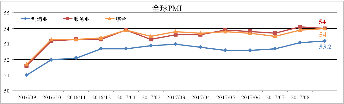 据HIS Markit与摩根大通发布的数据显示,9月份全球综合PMI为54,较8 月扩大0.1个百分点。其中服务业PMI为54,较上月下降0.1个百分点,制造业 PMI为53.2,均较上月扩大0.1个百分点。