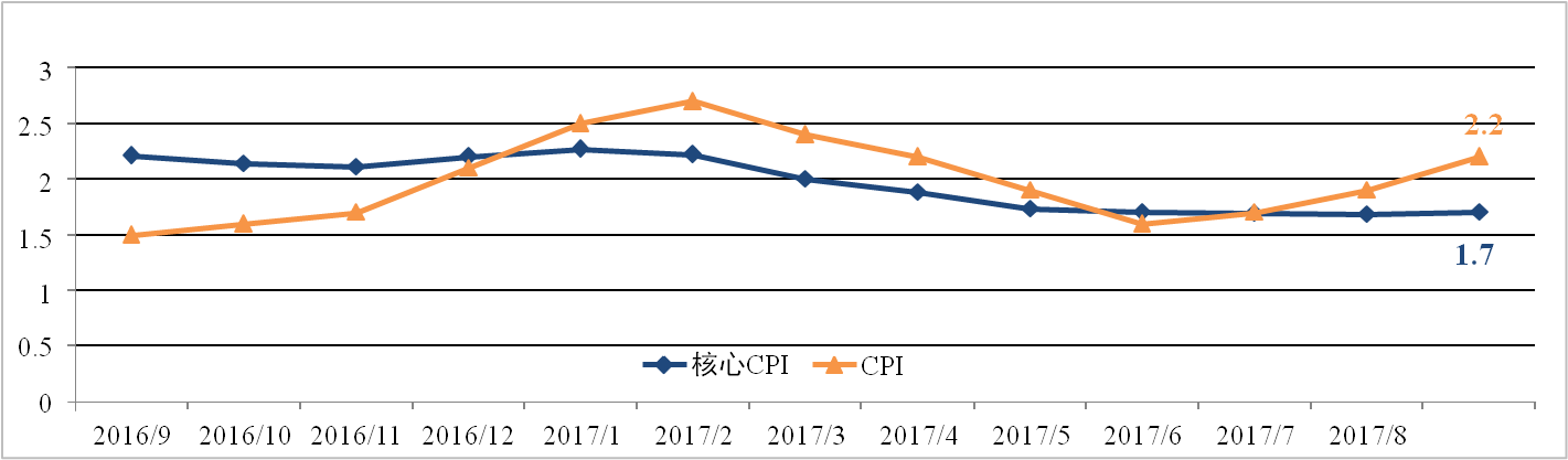 美国9月物价指数增速回升,但略低于市场预期。9月美国CPI为2.2%,较 上月扩大0.3个百分点,核心CPI为1.7%,与上月基本持平。飓风袭击美国产 油区造成能源产能下降推高原油价格是CPI上涨的主要原因。