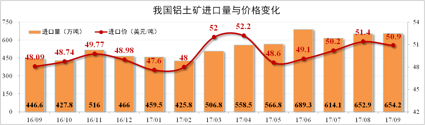 9月我国铝土矿进口量达654.2万吨,同比增长46.48%,环比增长0.2%。其中澳洲进口量达283万吨创下历史新高。铝土矿进口价格微幅下降至50.9美元/吨,环比下降0.97%。
