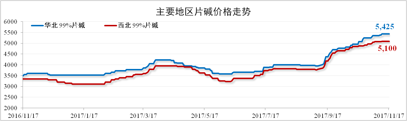 分析认为:11月上旬国内片碱供应紧缺,价格不断上涨。下旬,尽管采暖季氧化铝减产,对片碱的需求降低,但片碱供应减量而且前期预售理想,预计片碱价格仍将维持上涨趋势。