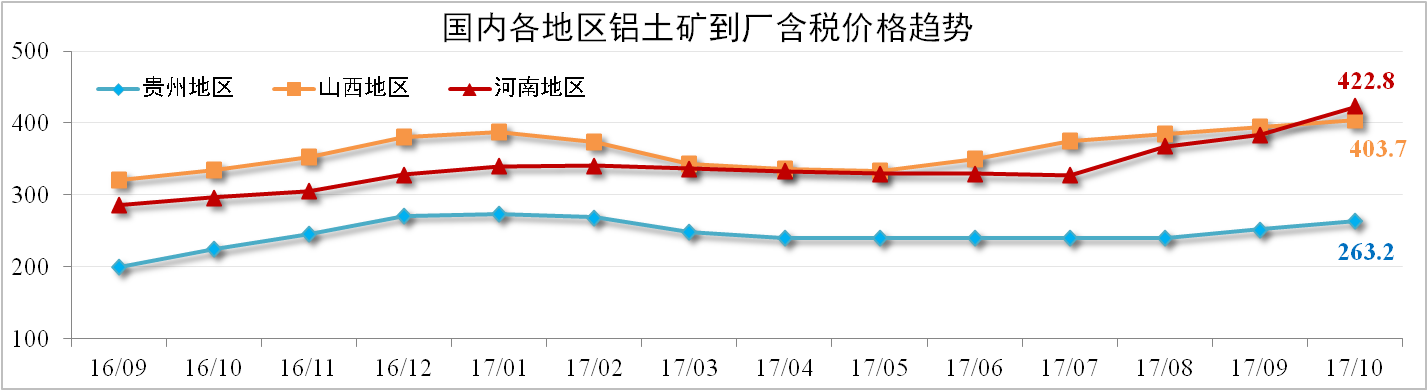 受十九大、环保稽查以及氧化铝需求旺盛的影响,10月份铝土矿供应紧缺加剧,价格不断上扬。其中,贵州(AL:60%,A/S:5.5-6.5)矿石含税价达到263.2元/吨,环比上涨4.69%;河南地区报422.8元/吨,环比上涨10.31%。