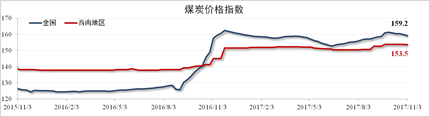 日前国家发改委召开新闻发布会,表示将力控冬季供暖期间煤炭价格。截至11月3日,中国煤炭价格指数报159.2点,环比下降0.5%,西南地区煤炭价格指数报153.5点,环比下降0.07%。