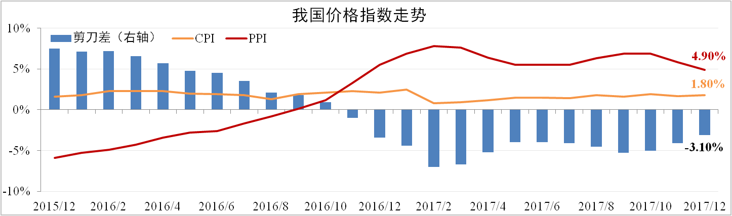 12月我国CPI同比增长1.8%,较上月扩大0.1个百分点,CPI年度涨幅为1.6%。PPI同比上涨4.9%,较上月下滑0.9个百分点,PPI年度涨幅为6.3%。