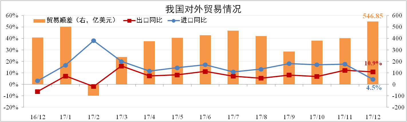 分析认为:内需转弱导致原材料进口量大幅下降致使进口增速大幅下滑。美国频繁挑起贸易摩擦会对我国2018年出口造成影响,而国内经济增速趋缓致使进口增速也面临回调压力。预计2018年进出口双双回落。