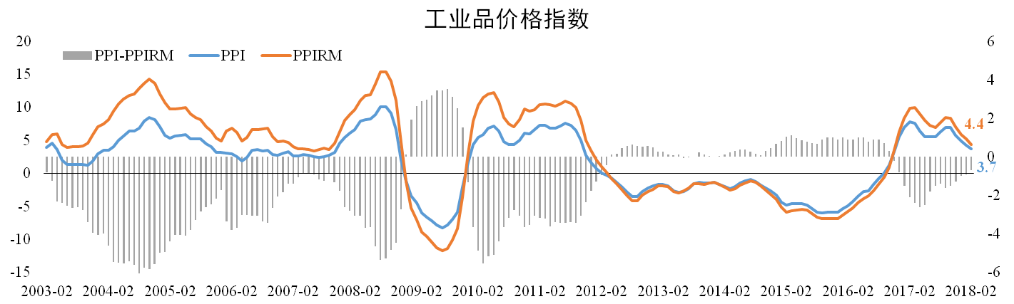 分析认为:PPI与PPIRM增速差距收缩反应工业企业盈利能力逐步改善。而受供给侧改革力度边际走弱以及终端需求放缓影响,叠加高基数效应,3月份PPI增速将继续下滑。