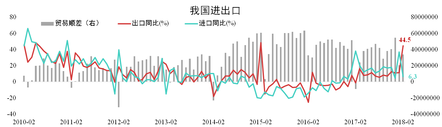 进出口增速出现分化,内需有转弱迹象。2月份出口同比增长44.5%,较上月大幅回暖;进口同比下滑30.3个百分点至6.3%。贸易顺差337亿美元,其中对美贸易顺差210亿美元,对美顺差扩大态势并未转变。