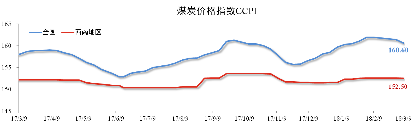 2月份我国煤炭价格呈现理性回落的趋势。截至3月9日,全国煤炭价格指数报160.6点,同比上升1.58%,环比下降0.8%。西南地区煤炭价格指数报152.5点,同比上升0.2%,环比下跌0.07%。