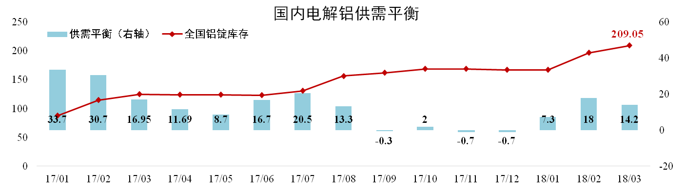 发稿时间:2018-04-27据阿拉丁数据,3月份我国电解铝产量302万吨,同比下跌2.89%,环比上升9.14%。净进口0.2万吨,总供应量302.2万吨,总消费量288万吨,当月理论供应过剩14.2万吨。3月底全国铝锭库存209.05万吨,环比上涨6.22%。