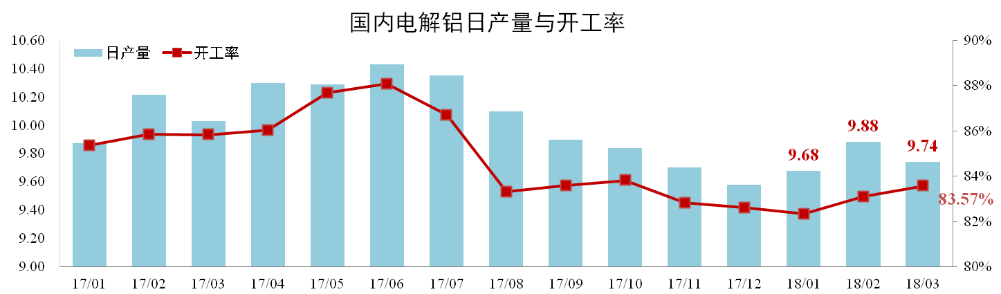 3月份中国电解铝总产能4359.8万吨,运行产能3643.7万吨,开工率83.57%,日产量9.74万吨,环比下降1.42%。截至4月19日,2018年国内新产能已投产46.3万吨,待开工269.95万吨,年内在建且可投产新产能395.75万吨。