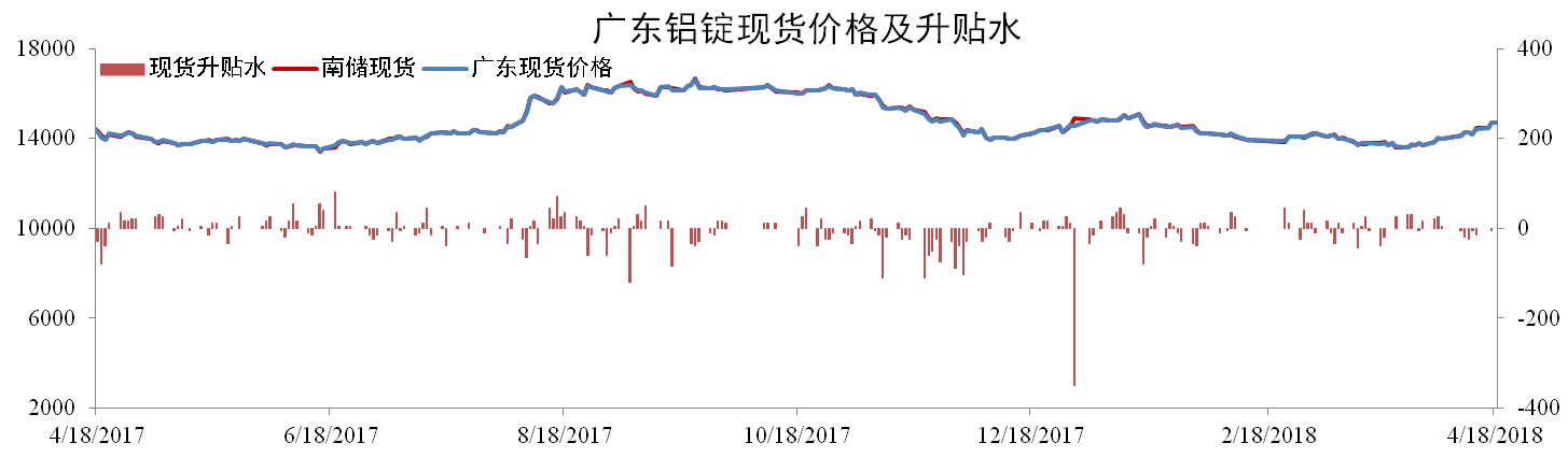 截至4月18日,南储华南铝锭现货价报14,720元/吨,环比上升6.74%,广东现货成交价报14,720元/吨,环比上升7.05%。截至2018年4月12日,全国铝锭库存为211.74万吨,环比上升3.13%。南海库存为42.11万吨,环比上升8.59%。