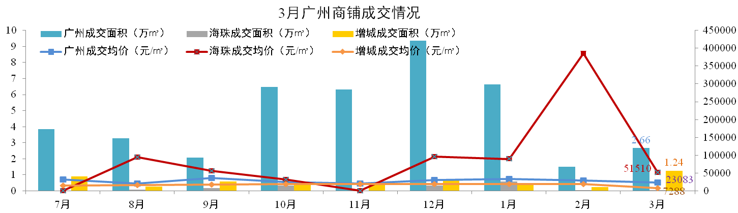 3月广州一手商铺成交2.66万㎡,环比增加88%。海珠区成交0.01万㎡,增城市场成交1.24万平米,环比上升474%。全市成交均价23,083元/㎡,环比下降18%,海珠区均价51,510元/㎡,增城区均价7,288元/㎡。