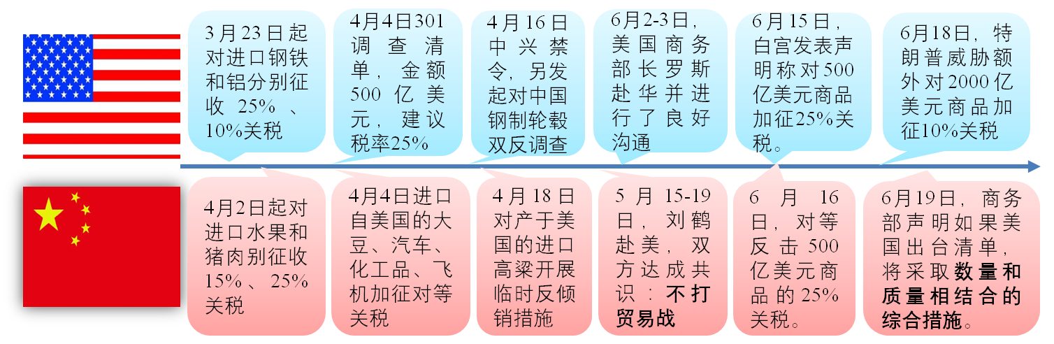 经过多次谈判,美国无视国家信誉正式开打贸易战。自7月6日起双方将对进口自对方的的500亿美元商品加征25%的关税。6月18日特朗普威胁加征2000亿美元商品10%关税,6月19日中方强硬反击,当天全球股指暴跌。