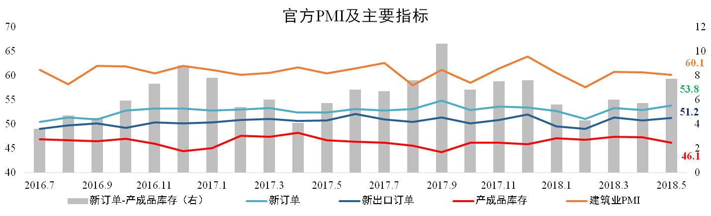 发稿时间:2018-06-225月份产成品库存为46.1点,较4月下降0.9个百分点;新订单为53.8点,较上月上升0.5个百分点,其中新出口订单为51.2,较上月上升0.5个百分点。建筑业PMI延续下滑走势,较4月下滑0.5个百分点至60.1点。