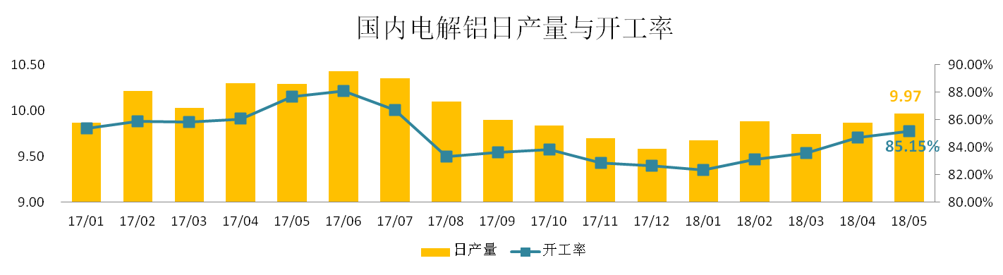 5月份中国电解铝总产能4369.8万吨,运行产能3735.2万吨,开工率85.15%,日产量9.97万吨,环比上升1.26%。截至6月17日,2018年国内新产能已投产51.7万吨,待开工290万吨,年内在建且可投产新产能369.5万吨。