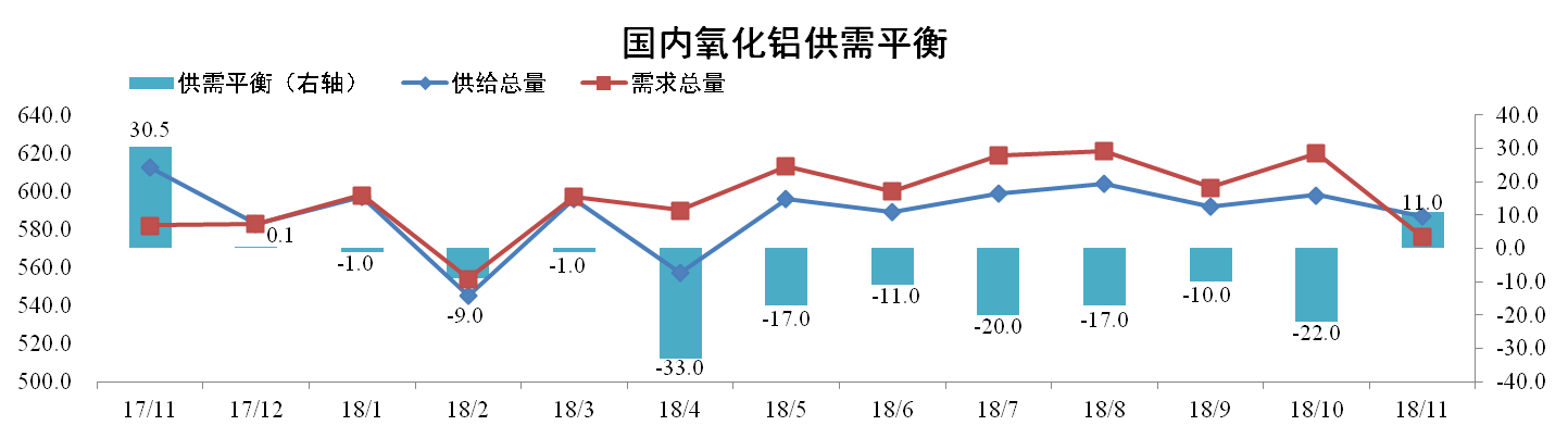 分析认为:11月河南地区多个氧化铝企业受采暖季影响进行限产,加之矿石价格居高不下,氧化铝供给总量稍有下降。12月利润驱使,会导致氧化铝产量有所增加,而下游电解铝企业需求疲软,预计供给过剩。
