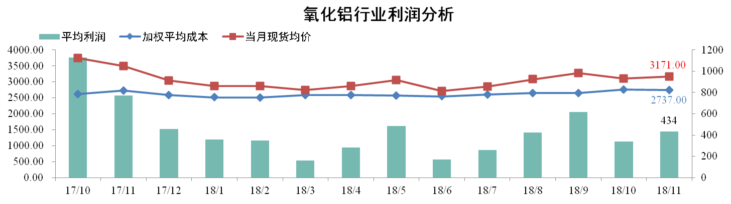 11月份国内氧化铝加权平均成本为2737元/吨,较上月下降0.76%。当月全国氧化铝现货成交均价为3171元/吨,较上月上涨2.30%。理论氧化铝行业平均利润水平为434元/吨。