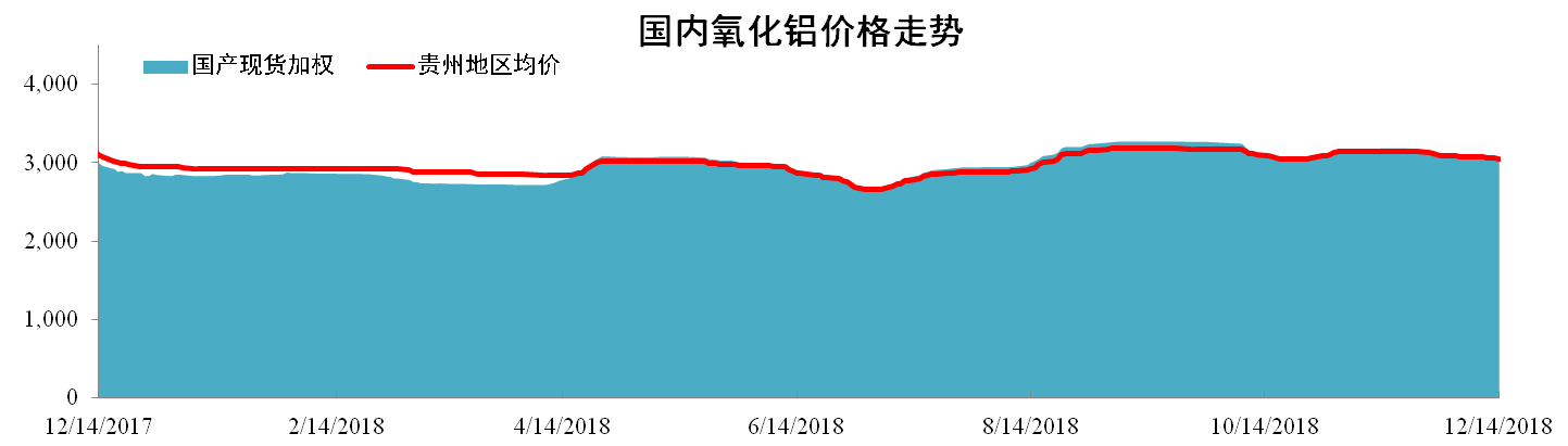 截至12月14日,国产氧化铝现货加权均价为3040元/吨,同比上涨1.33%,环比下降0.23%。贵州地区氧化铝现货加权均价为3050元/吨,同比下降1.61%,环比下降0.23%。