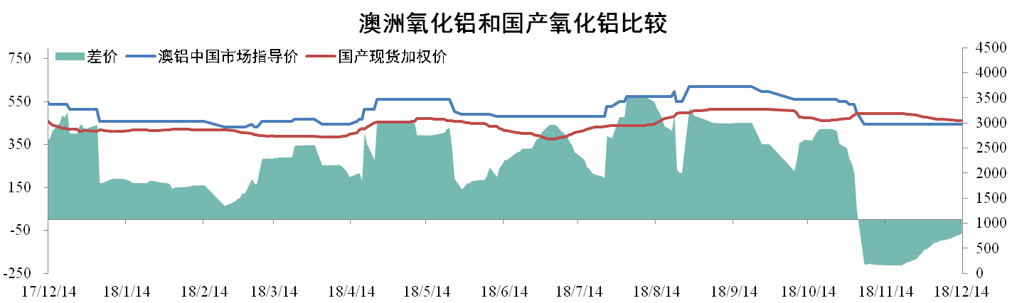 截至12月14日,国产氧化铝现货加权均价为3040元/吨,环比下降0.23%。澳铝中国市场指导价为2975元/吨,同比下降11.85%,国产氧化铝价格较澳铝指导价高出65元/吨。