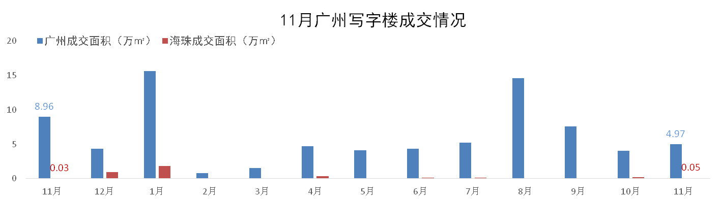 11月,广州一手写字楼成交4.97万m²,环比增加22%;其中海珠区一手写字楼成交0.05万m²,环比减少74% 。