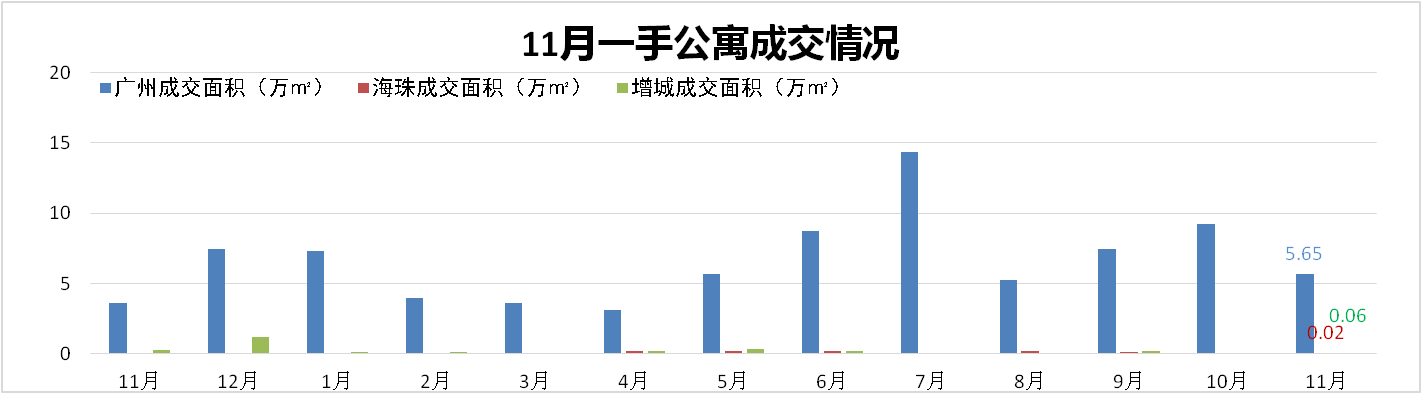 11月广州一手公寓成交1,047套,成交面积5.65万㎡,环比减少39%。海珠区成交面积0.02万㎡,环比减少25%;增城区成交面积0.06万㎡,环比减少36%。