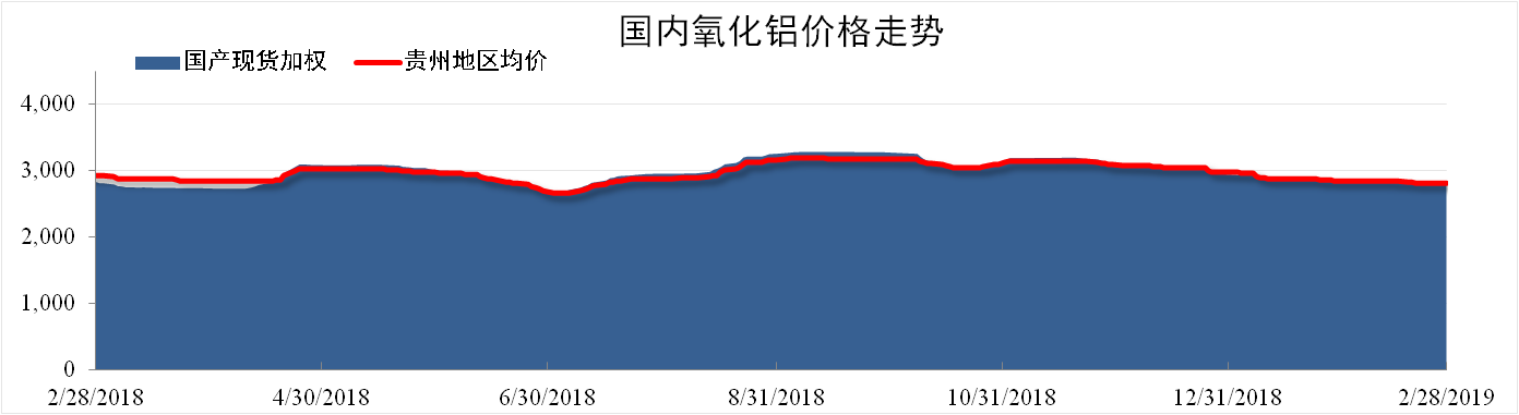 截至2月28日,国产氧化铝现货加权均价为2812元/吨,同比下降0.81%,环比下降2.18%。贵州地区氧化铝现货加权均价为2829元/吨,同比下降3.37%,环比下降2.22%。