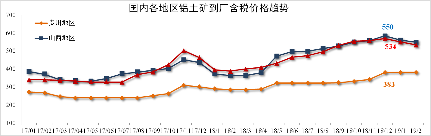 2月份,各地铝土矿价格有不同程度的下滑,贵州(AL:60%,A/S:5.5-6)到厂含税价月均价383元/吨,与1月价格持平;山西铝土矿550元/吨,环比下降2.03%;河南铝土矿534元/吨,环比下降3.09%。