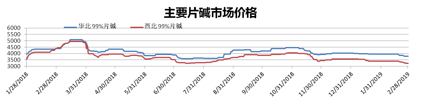 2月份国内片碱的总体成交有所下降,市场整体走势继续下行。截止到2月28日,西北99%片碱市场价为3225元/吨,环比下降3.42%;华北99%片碱市场价为3775元/吨,环比下降1.79%。