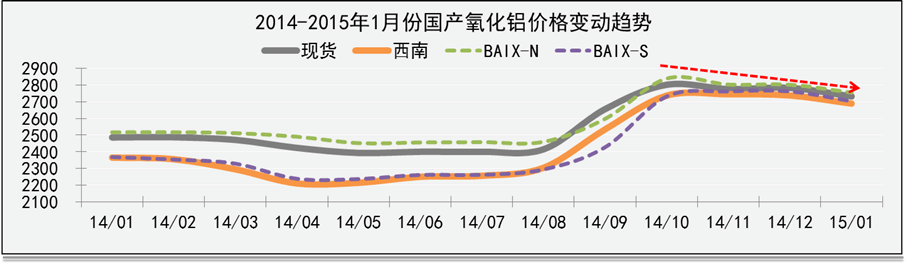 发稿时间:2015-01-242014年度我国氧化铝市场价格总体表现为“先抑后扬”的发展趋势,上半年市场整体延续了2013年度的弱势,北方地区氧化铝现货价格最低滑落至2350元/吨,创造了近四年来的新低。第三季度氧化铝现货价格前期较为平稳,后期价格则出现急剧攀升的良好发展趋势,促使氧化铝市场价格短期内提升至近三年的高点。第四季度氧化铝现货价格又逐步呈现回落趋势,并于2014年底基本企稳。整体上看,2014年度氧化铝国产现货加权价格为2544元/吨,同比上涨1.4%,西南地区均价为2420元/吨,同比上涨2.1%。